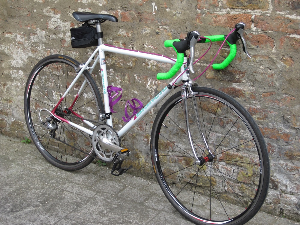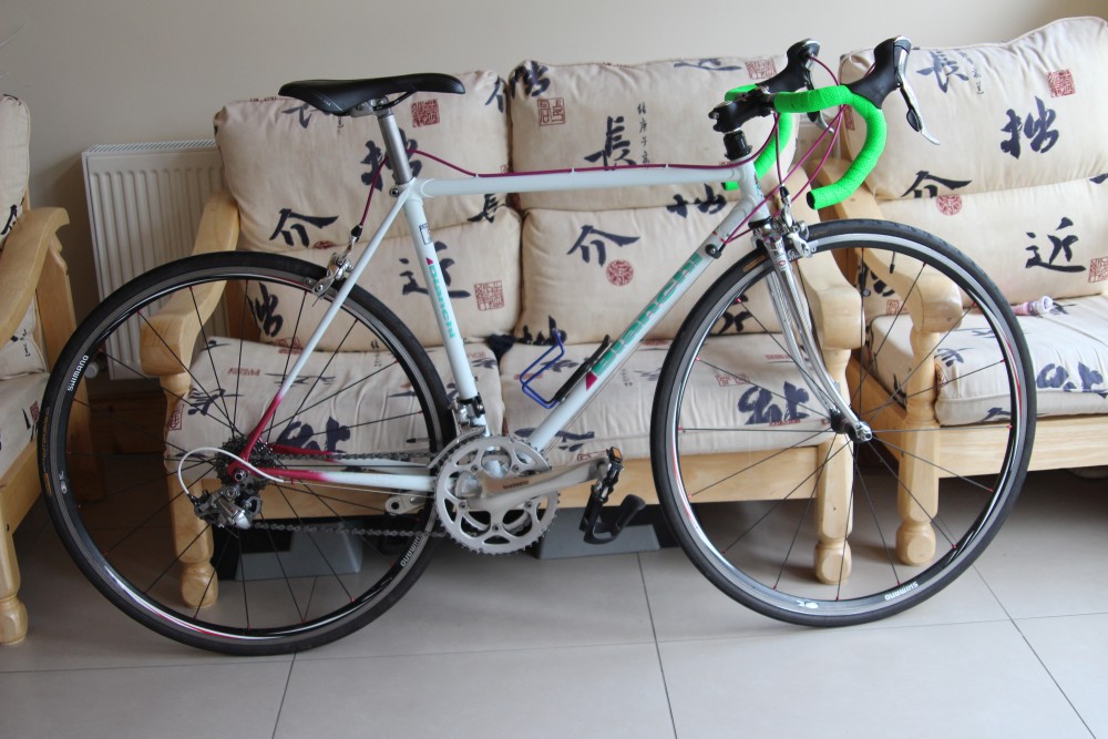 With the above assumptions, I set about installing a new italian threaded Shimano Holllowtech Bottom Bracket (had to buy this) and then the quill stem adaptor and 60mm stem. Now I was ready to start moving bits (Tiagra groupset, wheels, bars) from the donor bike to the Bianchi and fitting new cables, and cable housing (mauve) and new bar tape (flourescent green - my daughters idea!). The only mis-calculation in all of the above was the front derailleur clamp size. I had two Tiagra FDs, one was band on with a 34.9mm clamp, one was a braze on that I had fitted a 31.8 clamp (this was on the donor bike), but I needed a 28.6. The 28.6 clamps are expensive via eBay when shipping is included, and none of the online stores seemed to stock it so I considered making a shim for one of the other clamps. As it turns out my local bike shop had one in the workshop for a very reasonable price. So the switchover of parts went like a dream.