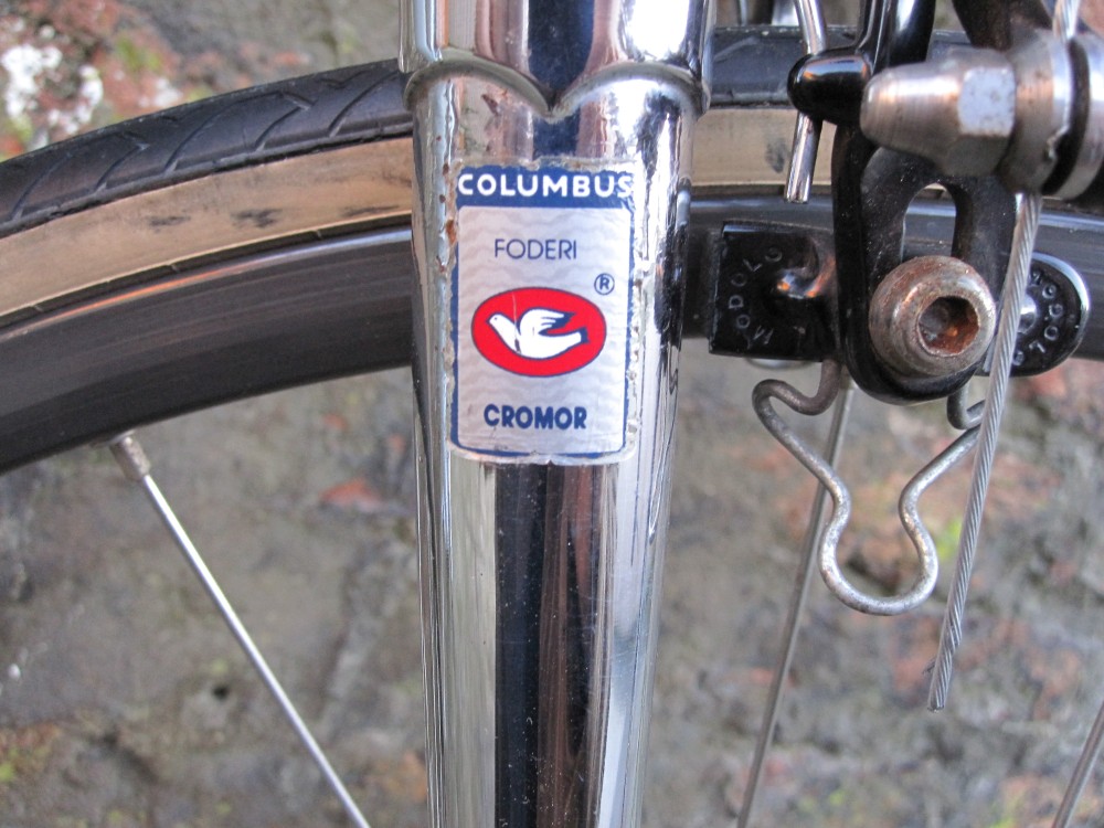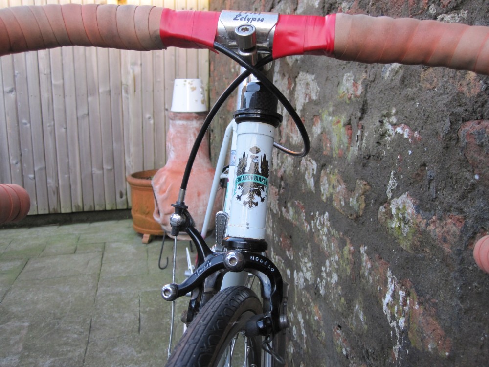 Components were a mish mash of Shimano Derailleurs, Campagnolo Shifters, Modolo Speedy Brake Calipers and noname levers (maybe Modolo). Wheels were Shimano hubs - maybe Exage, 7 speed HG Cassette, chain was worn, but not enough to wear the cassette, bars and (ugly) stem were ITM.