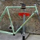 - The bottom bracket was easily removed to inspect the threads, and this was my surprise - French threads (as mostly expected) but they were damaged. Apparently a previous owner had decided to fit a threadless bottom bracket (probably because he could not get a French one) and had the edge of the BB shell machined ("camfered" I believe) at a 45 degree angle, which stripped off the first two or three threads from either side (and also left the next remaining thread a bit damaged). This would present problems - but there were options : fix the next remaining thread and fit a French threaded BB; fit a threadless BB; have the BB Shell rethreaded with Italian threads; reline the BB Shell with brass and have it rethreaded with British threads. These were all, to varying degrees feasible and they provided me with options.